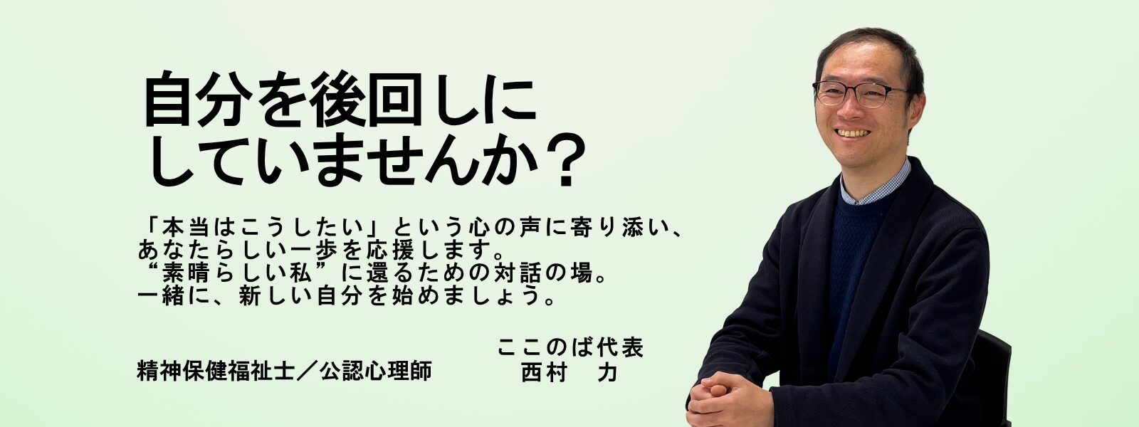 はじめまして。「カウンセリングスペースここのば」代表の西村です。福祉・医療・行政の現場経験と、精神保健福祉士・公認心理師としての専門知識を活かし、あなたの悩みに真正面から向き合います。家族・職場の人間関係、発達障害・精神疾患の支援、公的制度の活用など、「どこに相談しても納得できなかった」と感じている方こそ、ぜひご相談ください。一般的なカウンセリングでは対応しきれない視点で、解決への道を一緒に歩みます。